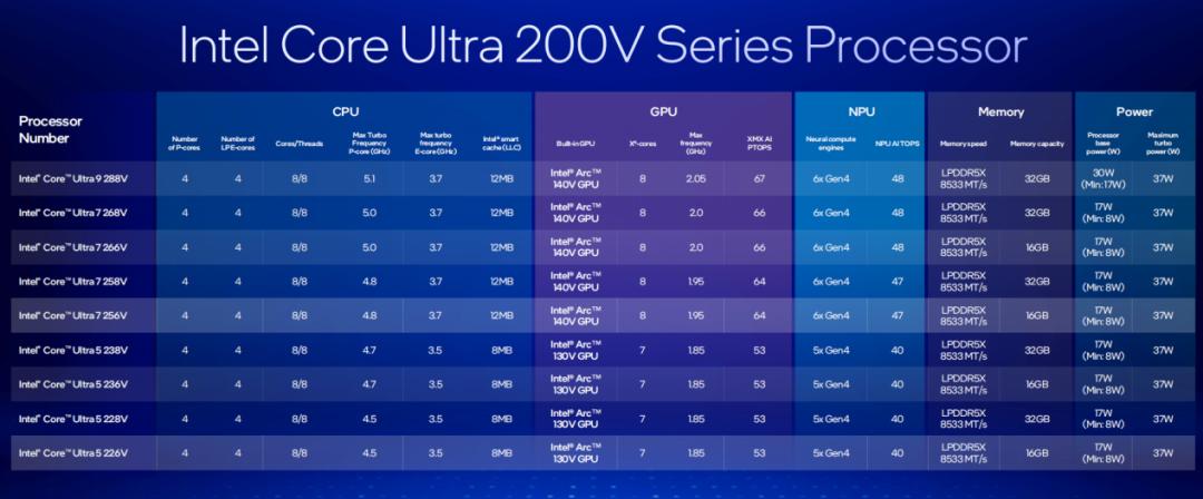 酷睿Ultra 200V系列处理器采用台积电N3B生产工艺、混合设计架构和统一内存设计,集成4个Lion Cove性能核心和4个Skymont能效核心,并且取消了超线程设计,所以它的规格只有8核心8线程。该系列处理器的集显采用全新的Xe 2架构,带来了30%的图像性能提升。此外,酷睿Ultra 200V系列处理器还内置基于NPU 4架构的新一代英特尔AI Boost NPU,其算力最高达到48 TOPS。