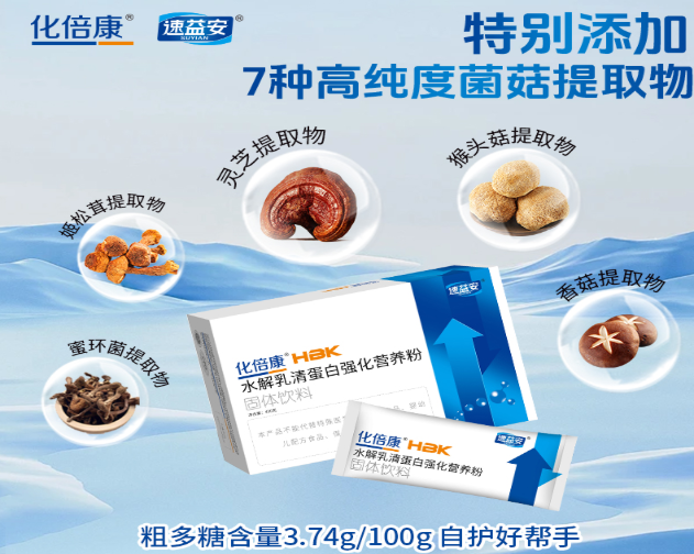 化倍康的配方里还复配了5种菌菇提取物(香菇、猴头菇、姬松茸等),这些菌菇里的粗多糖成分,被多项研究证实能调节免疫、修复黏膜。一边用水解乳清蛋白给骨髓送造白细胞的“原料”,一边用菌菇多糖帮着稳住免疫系统。很多患者关心的 “化疗后白细胞低吃什么补得快”“除了升白针还有啥办法” ,化倍康给出的是一个踏实的答案:营养跟上,身体自己就有能力慢慢恢复。