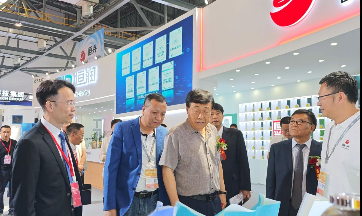 4月19日,全国政协委员、农业农村部原副部长马有祥(左二)到恒兴展台了解棚虾肽等“肽系列”产品