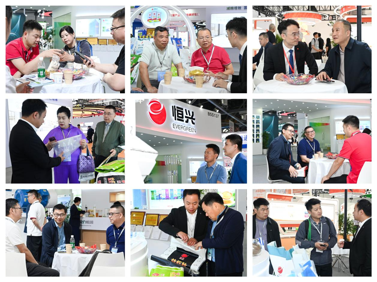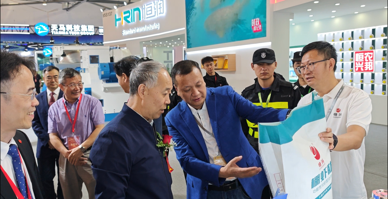 4月18日,国务院参事、农业农村部原副部长于康震(左三),中国饲料工业协会会长王宗礼(右二)到恒兴展台察看“肽系列”饲料的成果