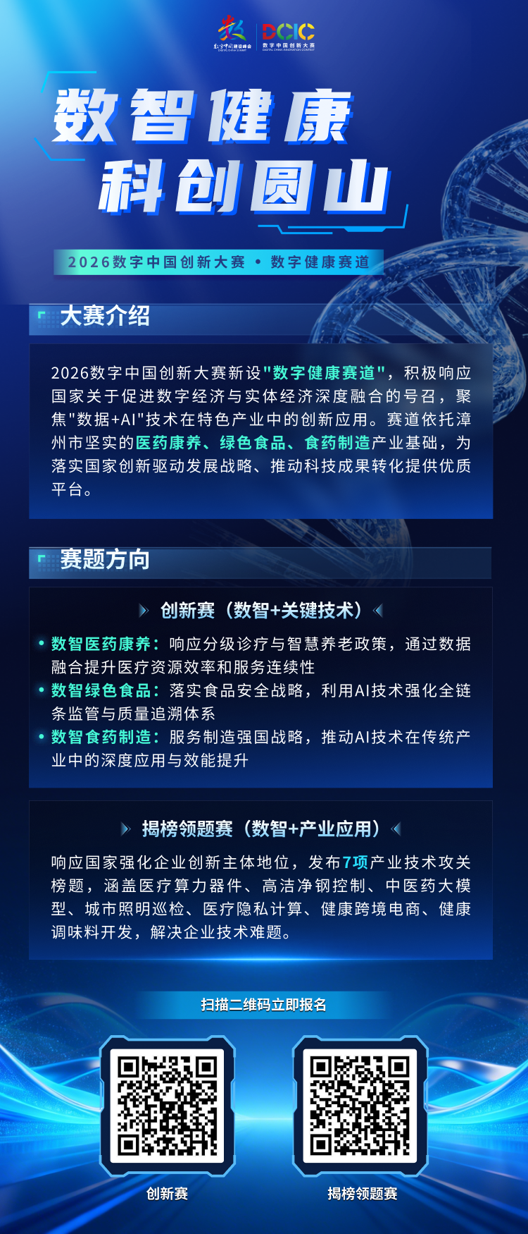 数智赋能无界,健康守护同行!2026数字中国创新大赛・数字健康赛道,邀你以技术创新破局健康产业发展难题,共筑数字健康新生态,快来报名参赛!